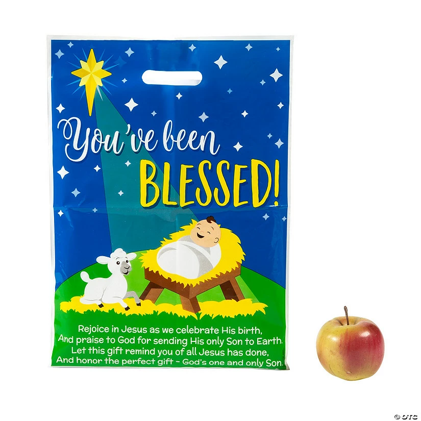 Bless someone with a cute goody bag featuring an image of Baby Jesus in the manger along with faith messaging. Fill these bags with Christmas treats and toys (sold separately on this website) and hand them out as Christmas party goody bags or as holiday bags for co-workers and friends. Plastic. (50 pcs. per unit) 12 1/2″ x 17″ with cutout handles. © OTC