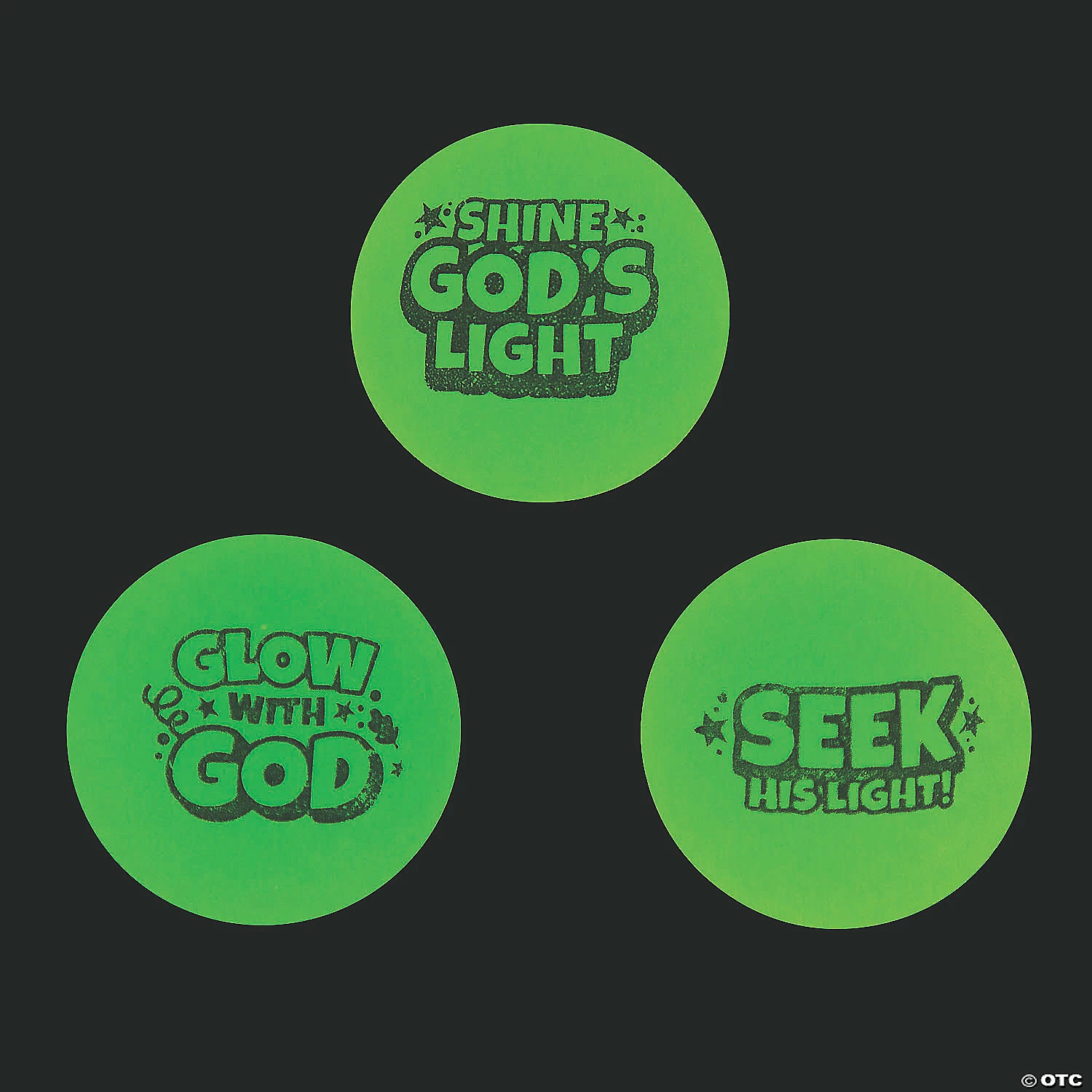 Let your love for the Lord bounce around! Great for trunk-or-treat religious giveaways, these bouncy balls glow-in-the-dark and feature spiritual sayings like βShine Godβs Lightβ. Kiddos will agreeβthese are the favorite toy for the Halloween season. Lights on or off, itβs fun to watch these bounce about! Rubber. 1 1/4″ (32mm) Expose items to direct daylight to activate glow. Β© OTC