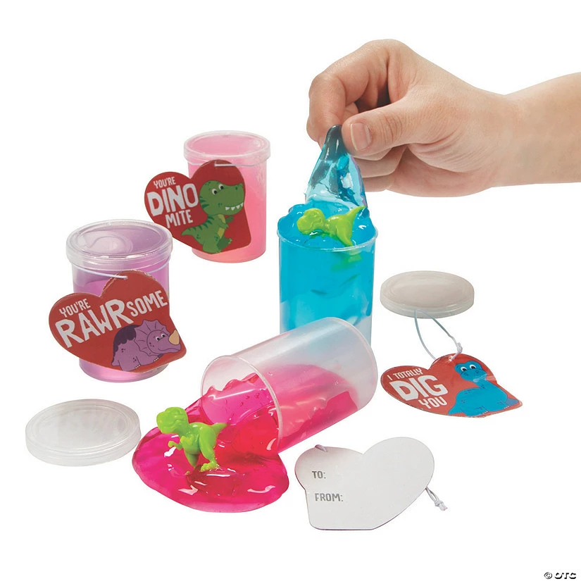 What a rawr-some way to impress your crush! Proof that sharing love will never go extinct, this dino-filled putty is great for Valentineโs Day party favors and classroom exchanges. This prehistoric pick acts as a great alternative to sugary candy on the most lovey dovey day. Share this for more fun and less cavities! Includes 12 containers and 12 cards with To/From space. Plastic. Container, 1 3/4″ x 2 1/2″. ยฉย OTC
