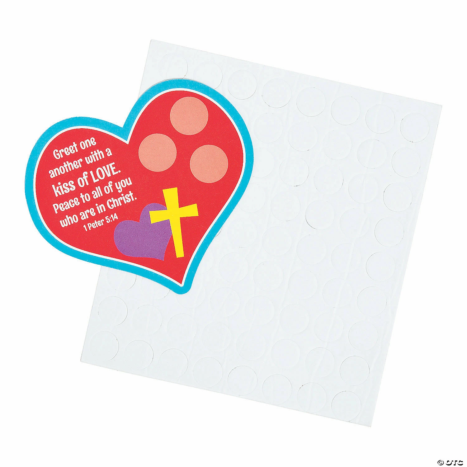 Have a faith-filled Valentine’s Day with these Valentine’s Day Cards! Featuring a Bible quote from 1 Peter 5:14 on the front side and a To/From space on the back, these cards are perfect for handing out at church or any religious school’s classroom exchange. Includes 2 dozen cards, double-sided self-adhesive foam stickers and approx. 54 Kisses®. Cardstock. 4″ x 3-1/2″ Individually-wrapped kisses. Simple assembly required. Total candy wt., 9 oz. © OTC