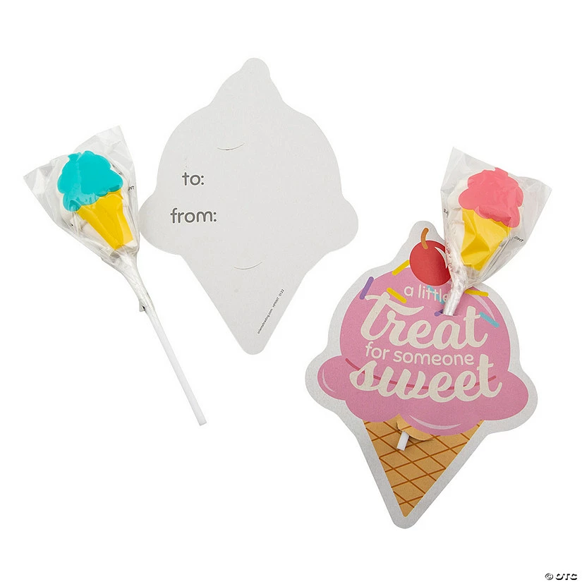 This kit makes it easy to hand out treats to those who are super sweet! Featuring a tasty lollipop with card, these giveaways are perfect for ice cream-themed parties and events. Use them as prizes and gifts in the classroom or drop them into goody bags as fun birthday party favors. These handouts are great for Valentineโs Day classroom exchanges, too! Includes 4 1/4″ x 5 3/4″ paper card with To/From space on back. Strawberry flavor. Individually wrapped. 1 1/4″ x 2 1/2″ pops on 4″ plastic sticks. Fat-free. Total wt., 7 oz. Simple assembly required.โข Candy is non-returnable. For more information, visit our โReturn Policyโ page located on our website. โข Ingredient, nutrition, allergen and other product information are provided on our Web and Mobile sites for reference purpose only, without warranty or representation as to accuracy. Manufacturers adjust their labeling regularly and are solely responsible for the accuracy of the information. For general questions concerning these items, please contact our customer service at 800-228-0475.