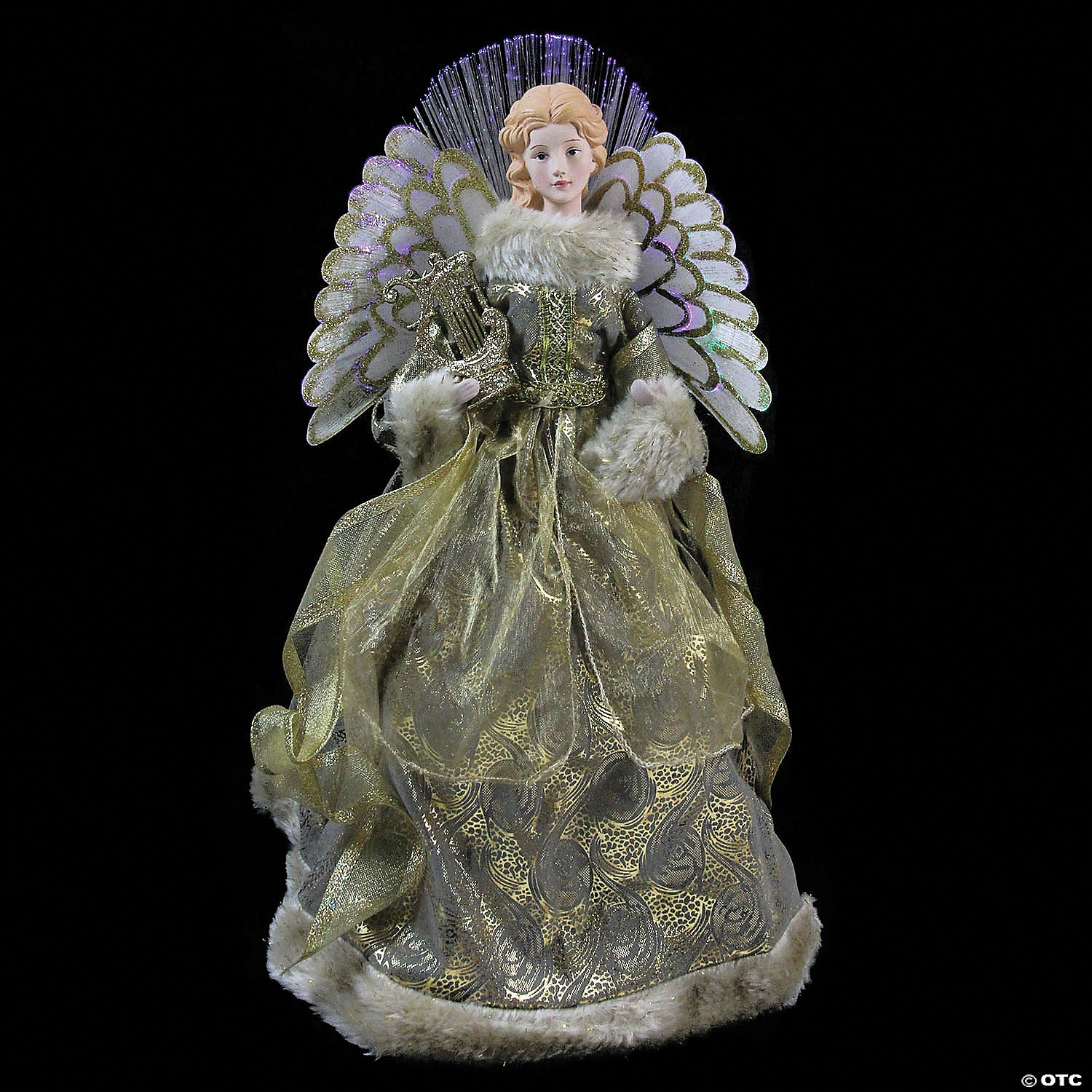 This gold and brown lighted Angel tree topper will make a commanding holiday centerpiece in your family room! The unique and modern tree topper yields an excellent way to decorate your tree. Add a festive touch to your space using this beautiful decor. Product Features: Angel is styled in a heavenly metallic gold print gown with faux fur trim on the bottom cuffs and collar Gold overlay and ribbon complete this outfit Holds a golden glittered harp Features stiffened white wings trimmed with gold outlined in fiber optics Under her dress there is a plastic cylinder attached to help her stand atop a tree or table Topper is so versatile that it can also be used as a tabletop decoration Additional Product Features: Constant color changing fiber optic wings Fiber optic colors include white purple pink blue green yellow and red Requires (3) “AA” size batteries – not included On/off switch on the battery pack Dimensions: 16″H x 9″W x 5″D Material(s): resin/fabric/plastic optical fibers (POF) Special Shipping Information: This item ships separately from other items in your order. This item cannot ship to a P.O. Box. This item may be subject to additional processing days. ITEM IS NOT ELIGIBLE FOR EXPEDITED SHIPPING