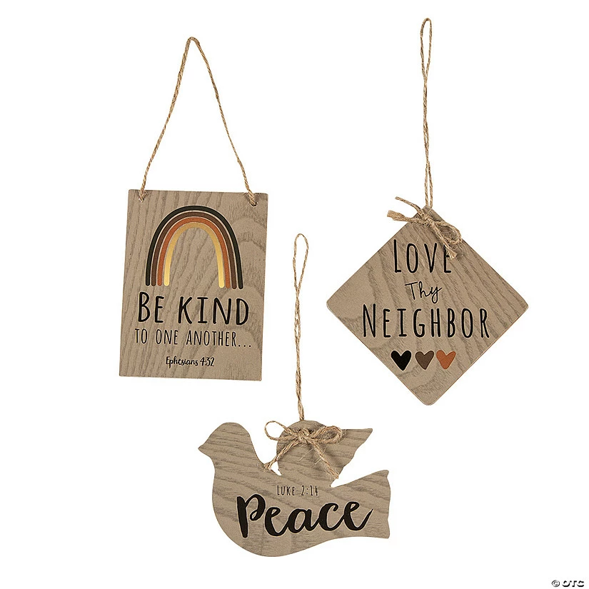 Decorate your Christmas tree with some reminders to be kind. These wood ornaments come in different shapes and feature phrases like, βLove thy neighbor,β βPeace,β and, -from the New Testament Bible verse in Ephesians 4:32 – βBe kind to one anotherβ¦β Hang these thoughtful ornaments on your own tree or gift them to friends and family. Wood. 3″ – 4-1/4″ x 2-3/4″ – 4-1/4″ with jute hangers. Β© OTC