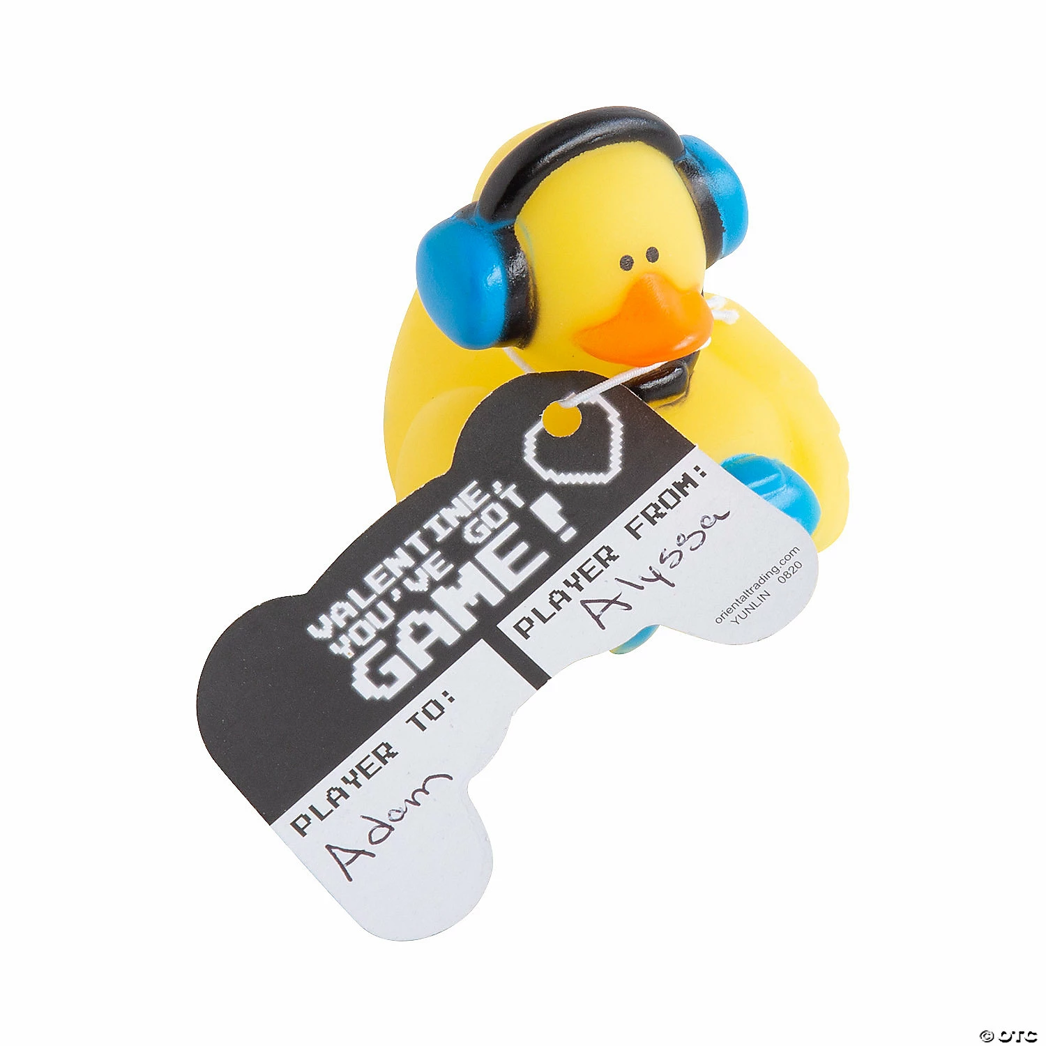 Get into the Valentine exchange game with these cute gamer rubber duckies with cards. Each gamer duck comes with a video game controller-shaped card featuring a To/From space and the message, โValentine, youโve got game!โ A great choice for classroom Valentineโs Day exchanges or for kids to hand out to their friends, these Valentine handouts arenโt for noobs! Includes To/From space on 2 1/2″ x 1 1/2″ cardstock card. Vinyl. 2 1/4″ Duckies do not float upright. ยฉ OTC